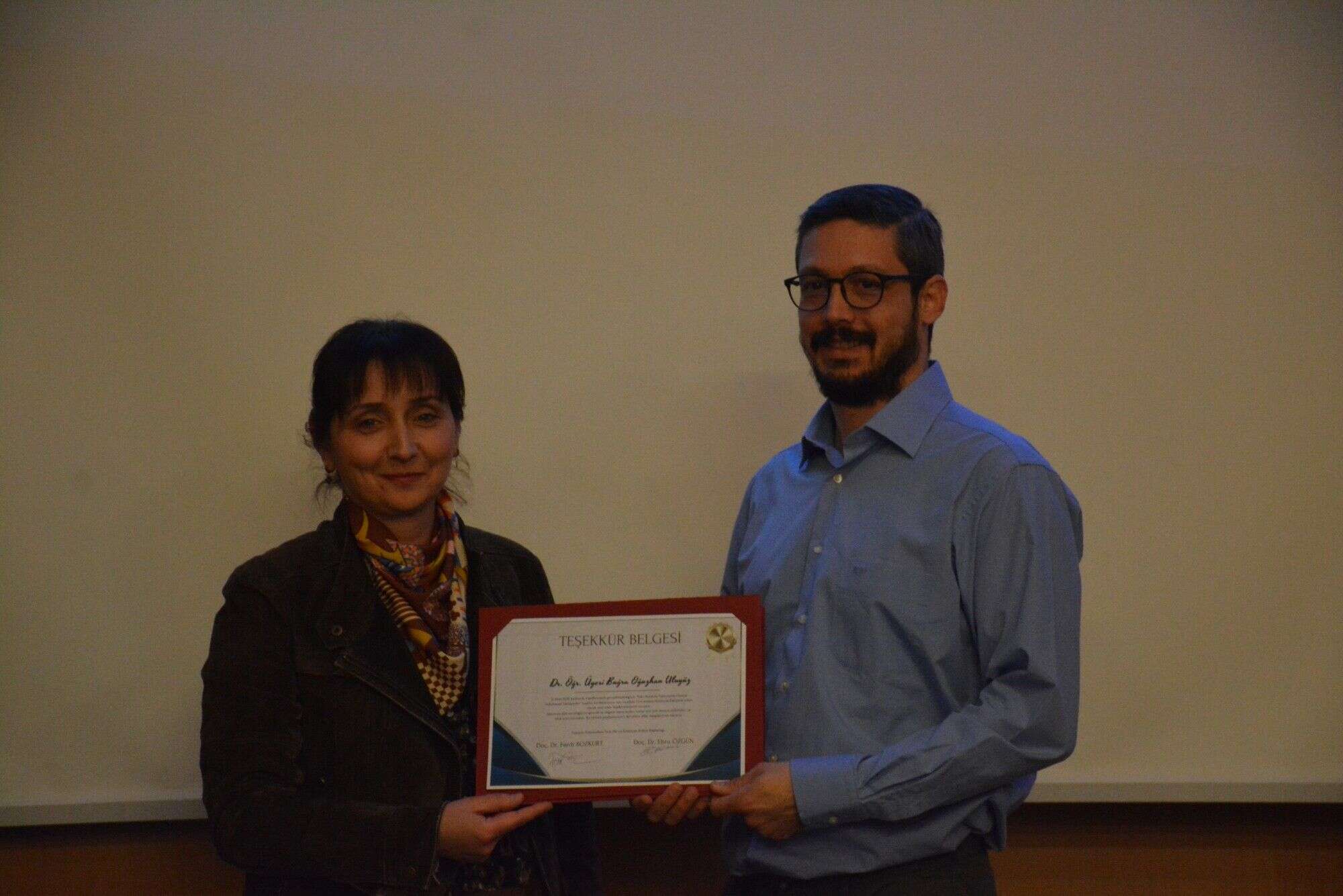 Etkinlik, soru-cevap bölümünün ardından Doç. Dr. Ebru Özgün’ün Dr. Öğr. Üyesi Buğra Oğuzhan Uluyüz’e teşekkür belgesi takdim etmesiyle sona erdi.