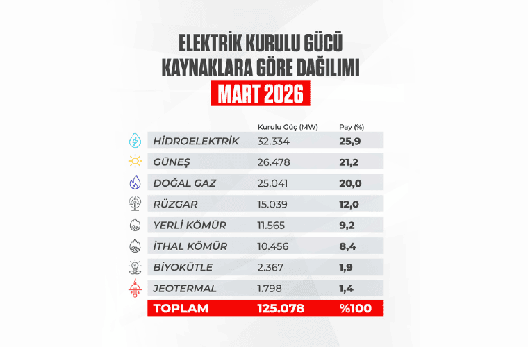 Mart ayı itibarıyla, güneş enerjisinin payı 26.478 megavat ile yüzde 21,2‘ye, rüzgâr enerjisi ise 15.039 megavat ile yüzde 12‘ye ulaştı. Güneş ve rüzgârın toplam kurulu güçteki payı ise 41.517 megavat ile yüzde 33,2 oldu.